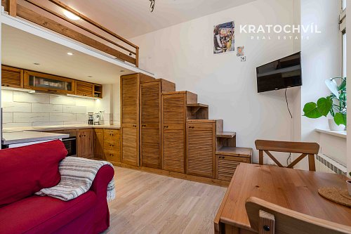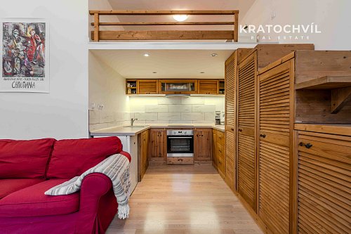 Hlavní výhodou tohoto bytu jsou vyšší stropy a vestavěné patro na spaní, což zvětší plochu bytu. V koupelně je sprchový kout, místo pro pračku se sušičkou, na podlaze jsou plovoucí podlahy a dlažba.