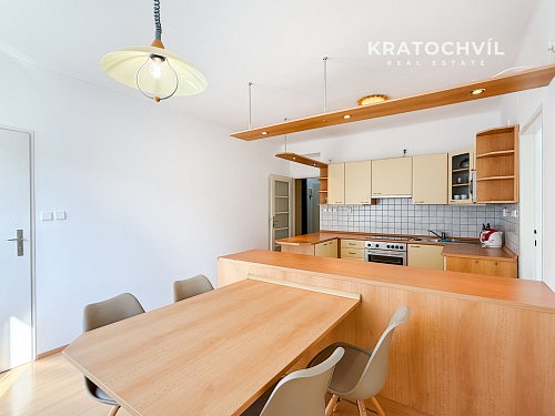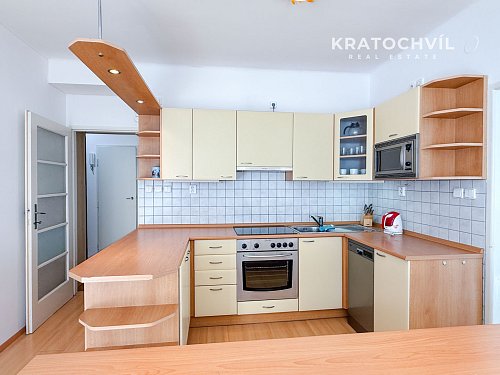 Dominantou bytu je velkorysá kuchyně s jídelním prostorem a barovým pultem, která je vybavena spotřebiči včetně myčky nádobí, trouby, varné desky, mikrovlnné trouby a pračky. Kuchyň nabízí dostatek úložného i pracovního prostoru.
