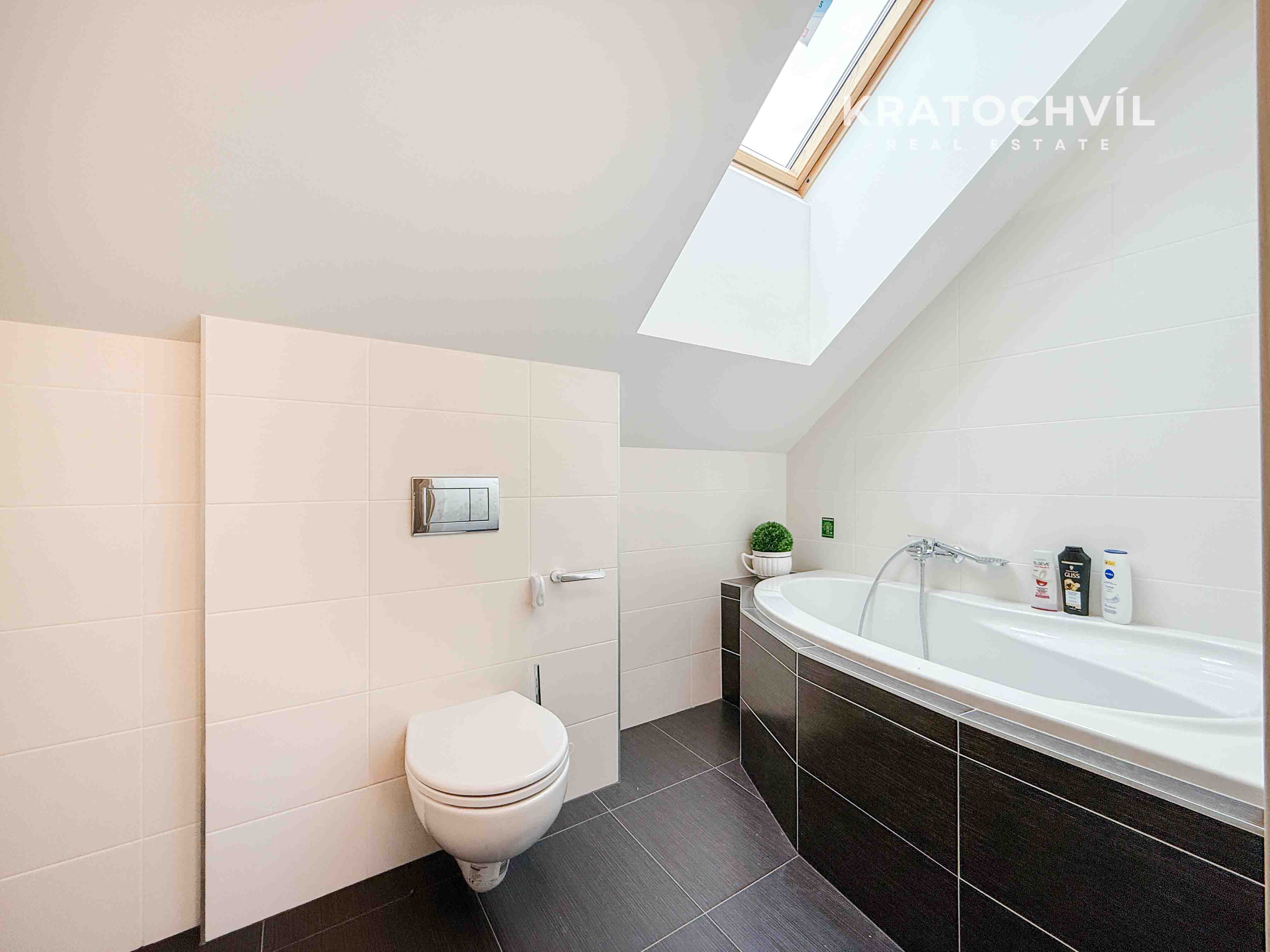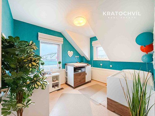 V patře jsou 3 ložnice, chodba a koupelna s vanou a WC.