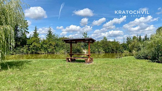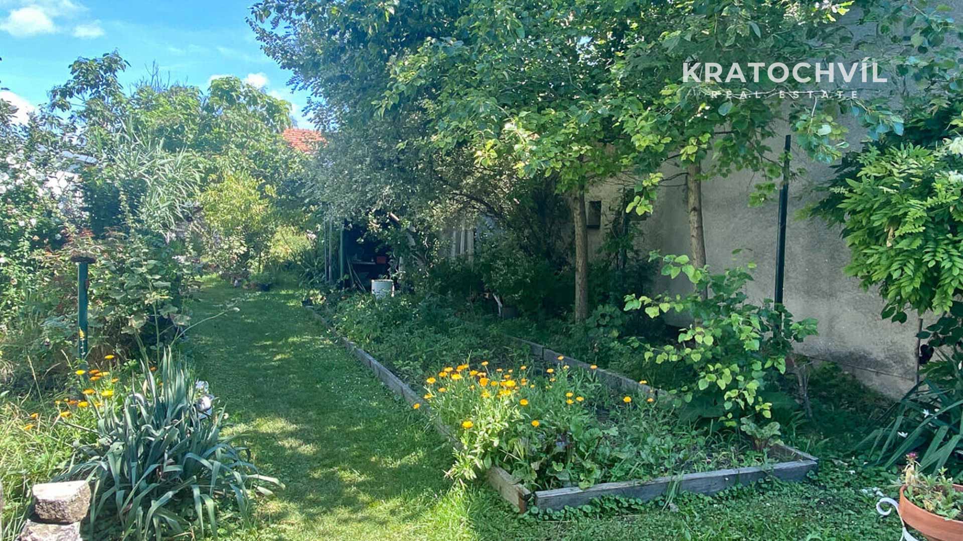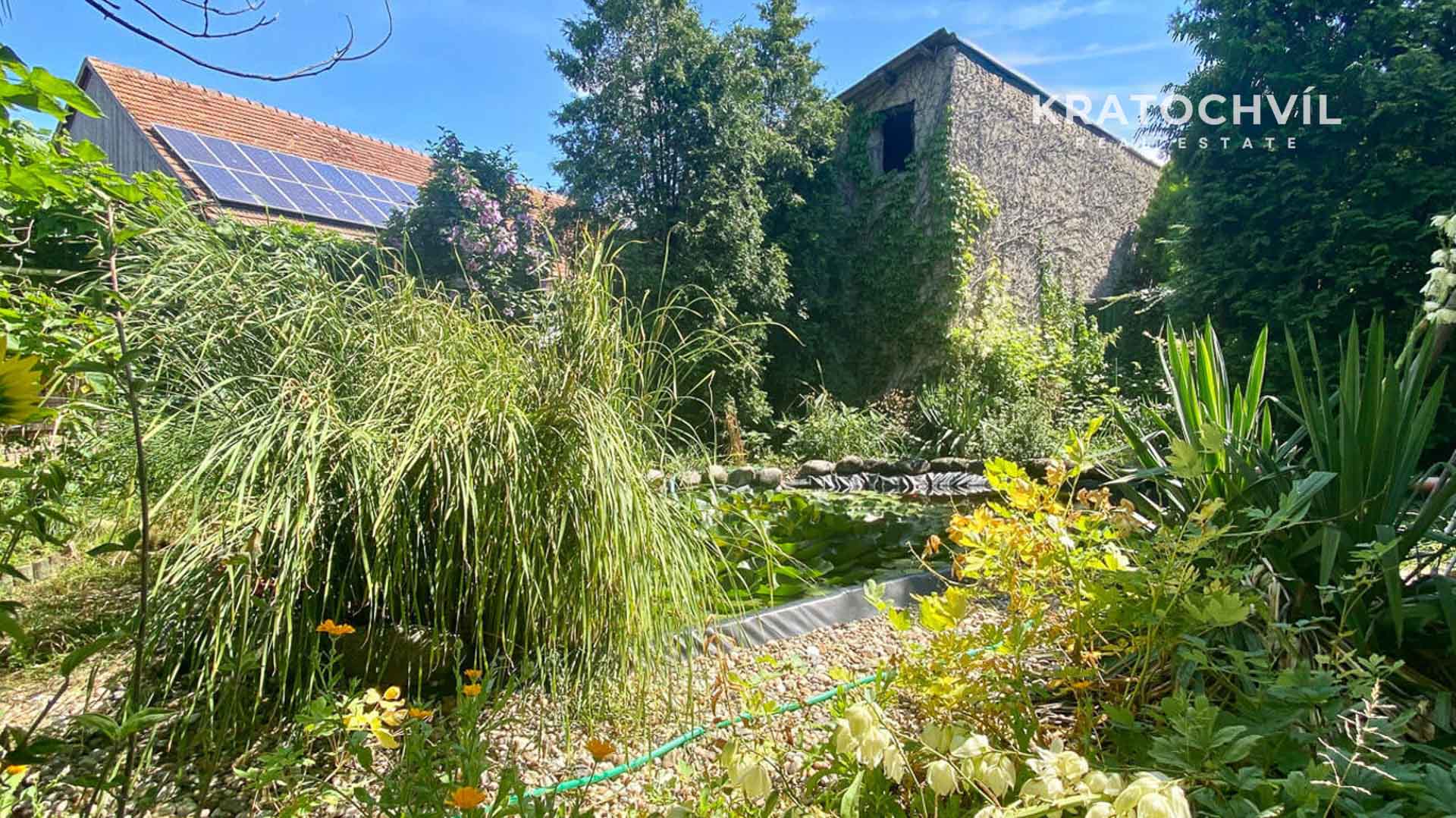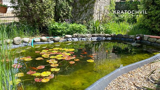 V přední části pozemku se nachází upravená zahrada se vzrostlými stromy, okrasnými keři a jezírkem, která vytváří příjemné soukromí a klidné prostředí pro bydlení.